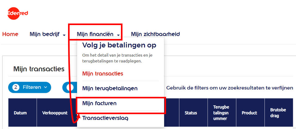 Deze facturen worden maandelijks naar u verzonden en zijn beschikbaar in je MyEdenred handelaarsaccount, onder "Mijn financiën" > "Mijn facturen".